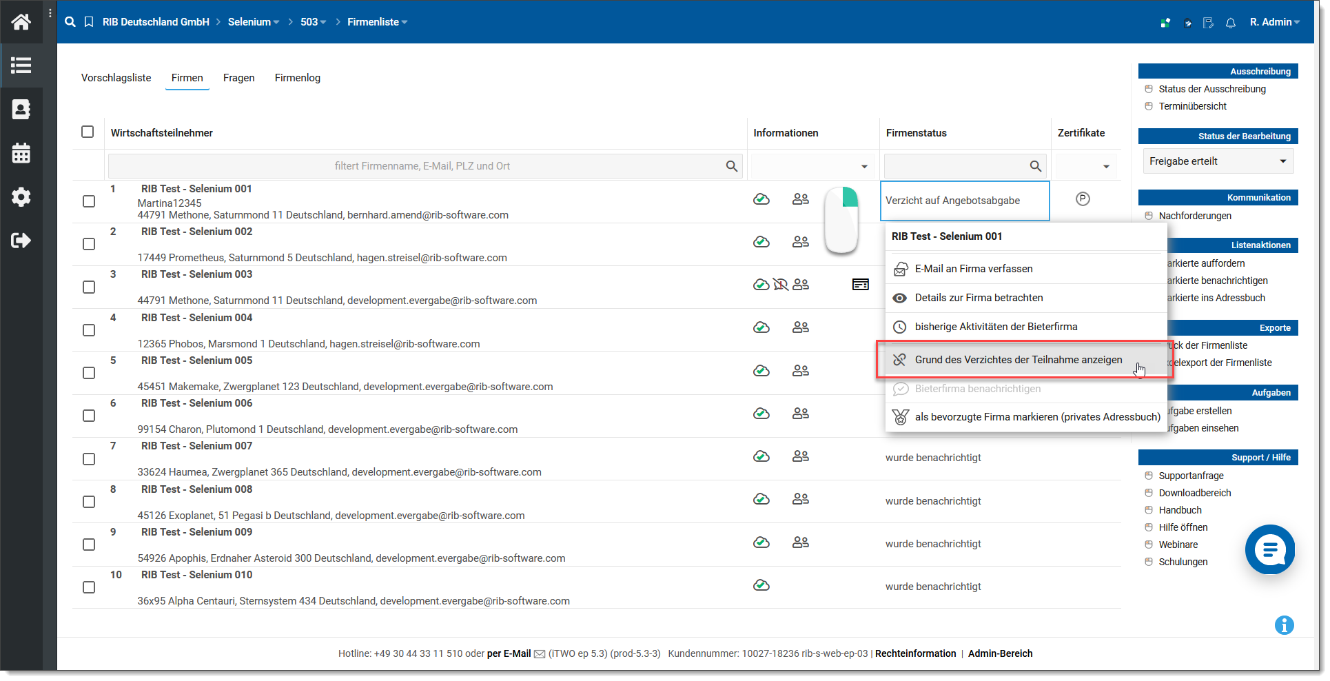 Über die rechte Maustaste können dann für diese Firma die Absagegründe eingesehen werden.