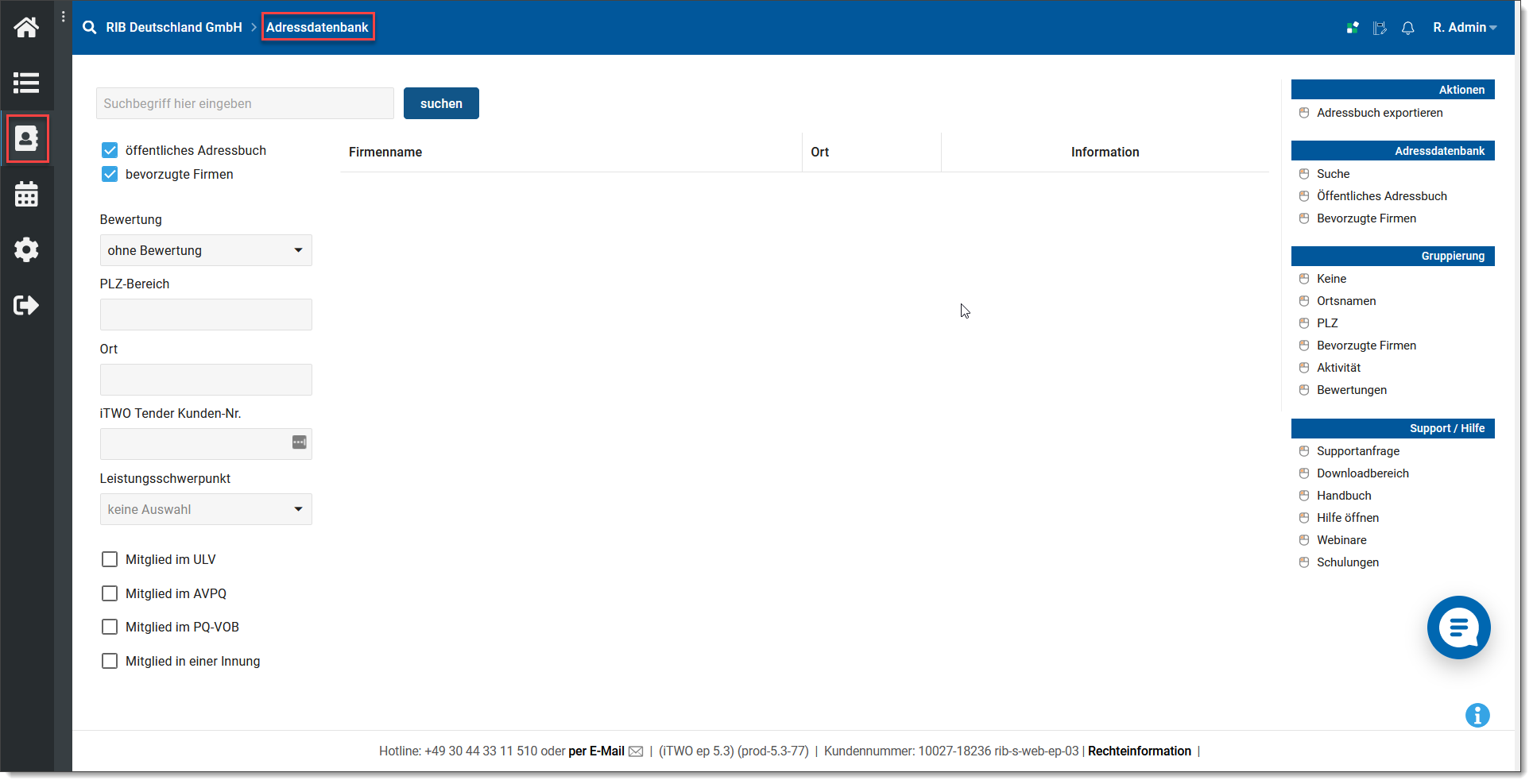 Die Vergabeplattform verwaltet eine eigene Adressdatenbank. Hier werden Firmen die sich an der Plattform registriert über iTWO Tender (Bieterplattform unter www.meinauftrag.rib.de) haben und ein elektronisches Angebot abgeben können angezeigt und verwaltet. Firmen können als bevorzugte Firmen markiert und gespeichert werden.