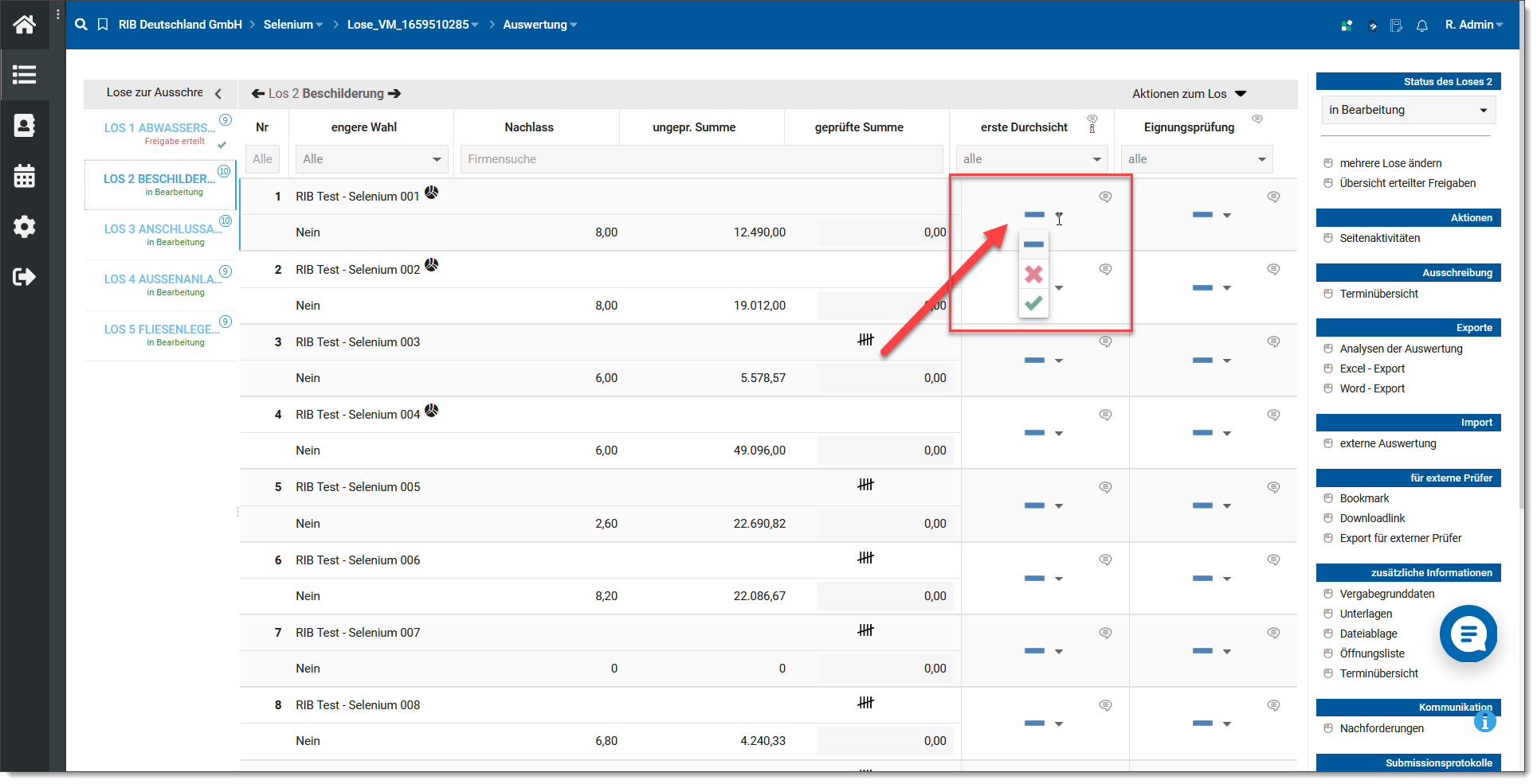 Ihnen stehen pro Spalte (in diesem Beispiel sind die Prüfungsschritte erste Durchsicht, Eignungsprüfung und Preisprüfung) die Auswahl der Wertung zur Verfügung.