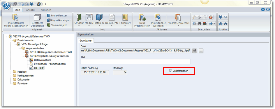 Existierten in einer RIB iTWO Vergabeeinheit Dokumente, dann werden diese an die Plattform vergabeplattform.berlin.de übertragen. Hierzu muss zu dem entsprechenden Dokument die Option Veröffentlichen aktiviert sein.