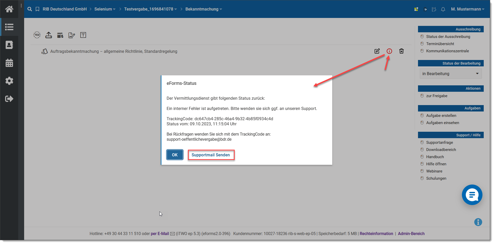 Wichtig und mit der Bitte um Beachtung: Der RIB eVergabe Support kann in diesen Fällen nicht helfen, da wir den Grund des Fehlers in der Regel nicht kennen. Hier anzeigte Fehler kommen vom Vermittlungsdienst und nicht von der RIB-Plattform. Wenden Sie sich bitte daher in solchen Fällen nicht an den RIB eVergabe Support, sondern senden Sie eine E-Mail mit dem Fehler und der Trackingnummer an support-oeffentlichevergabe@bdr.de.