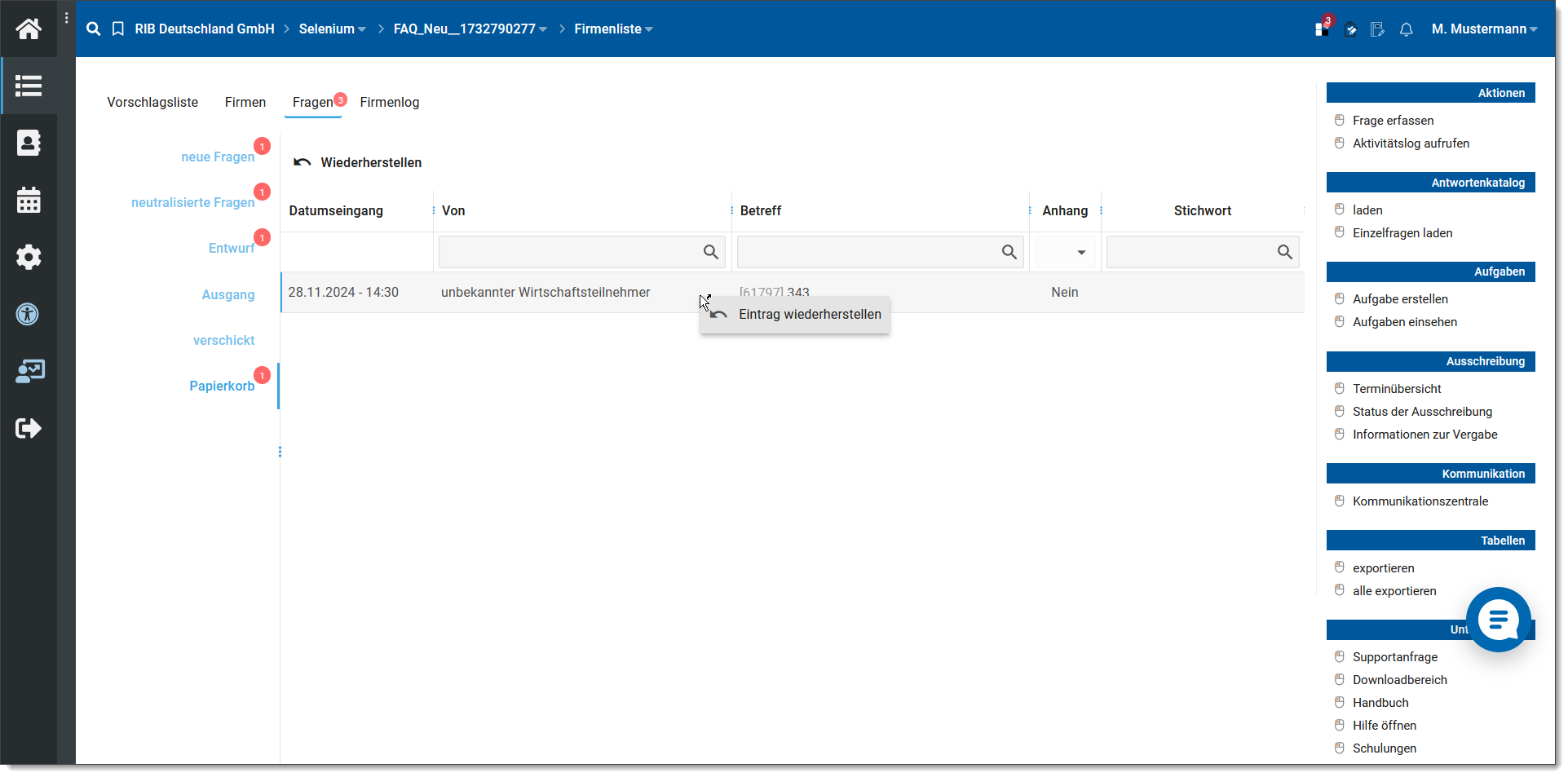 Die Vergabestelle (hierfür autorisierte Benutzer) kann Bieterfragen löschen. Dies betrifft sowohl Fragen die von den Bietern über iTWO Tender (Bieterplattform unter www.meinauftrag.rib.de) elektronisch gestellt, als auf Fragen die von der Vergabestelle manuell erfasst wurden.