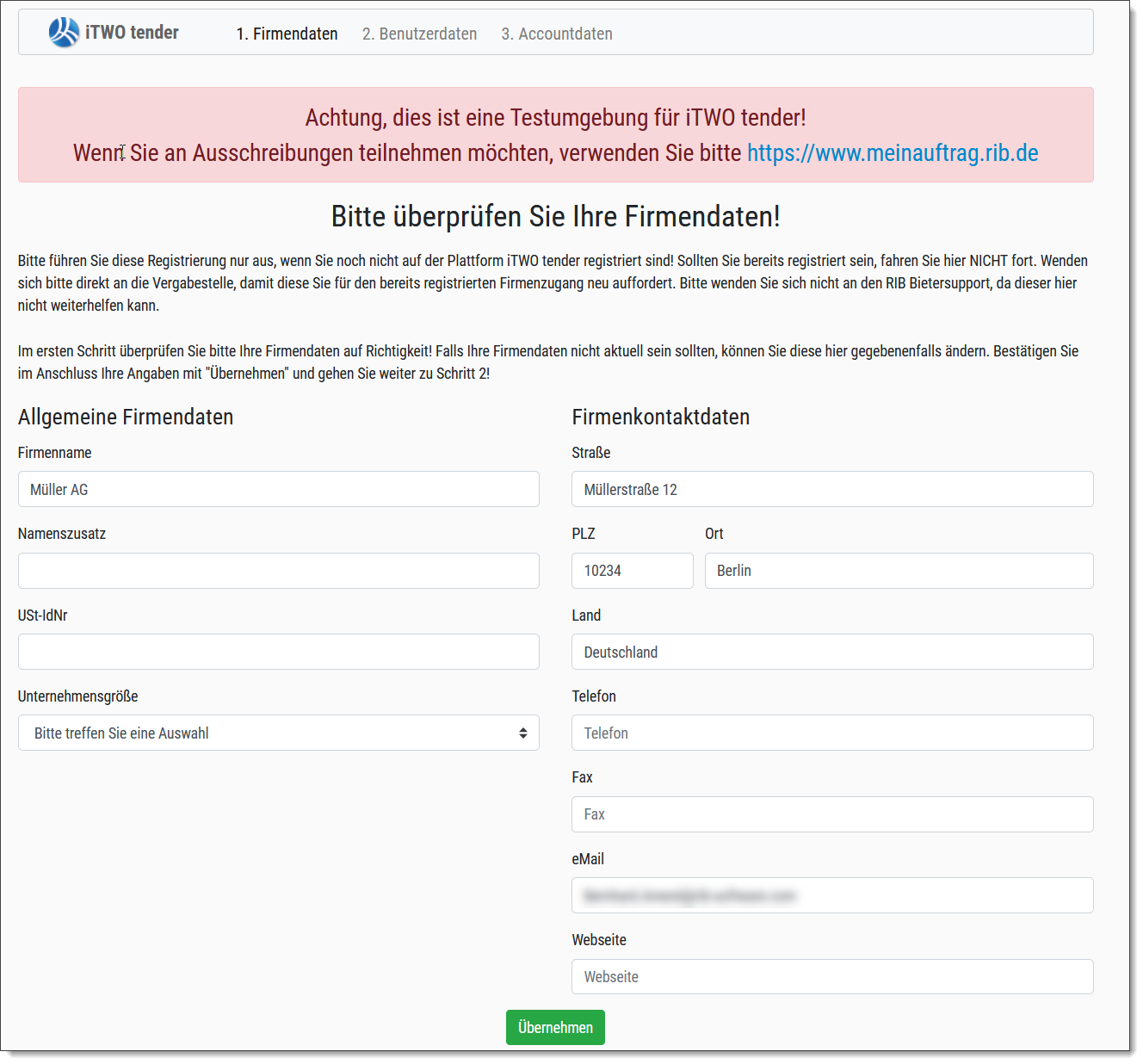 Klickt der Bieter auf den Link im Bild im rot markierten Abschnitt, sind seine Adressdaten für die Registrierung schon vorausgefüllt. Das folgende Bild zeigt als Beispiel die Testumgebung von iTWO Tender (Bieterplattform unter www.meinauftrag.rib.de). Dort sind die Felder, welche die Vergabestelle erfasst hat, für den Bieter schon vorausgefüllt. Er kann diese ergänzen oder korrigieren und sich mit Klick auf Übernehmen registrieren. Er muss dann in einem zweiten Schritt seine Benutzerdaten ausfüllen und in einem dritten Schritt seine Firmendaten.