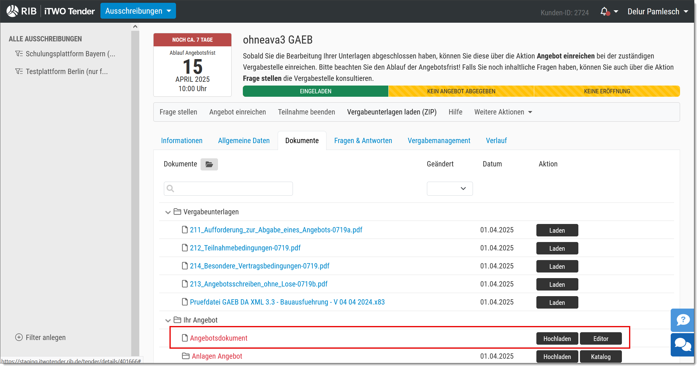 Die GAEB-Datei wird den Bietern im Bieterportal iTWO Tender (Bieterplattform unter www.meinauftrag.rib.de) unter den Dokumenten im Bereich Vergabeunterlagen bereitgestellt.