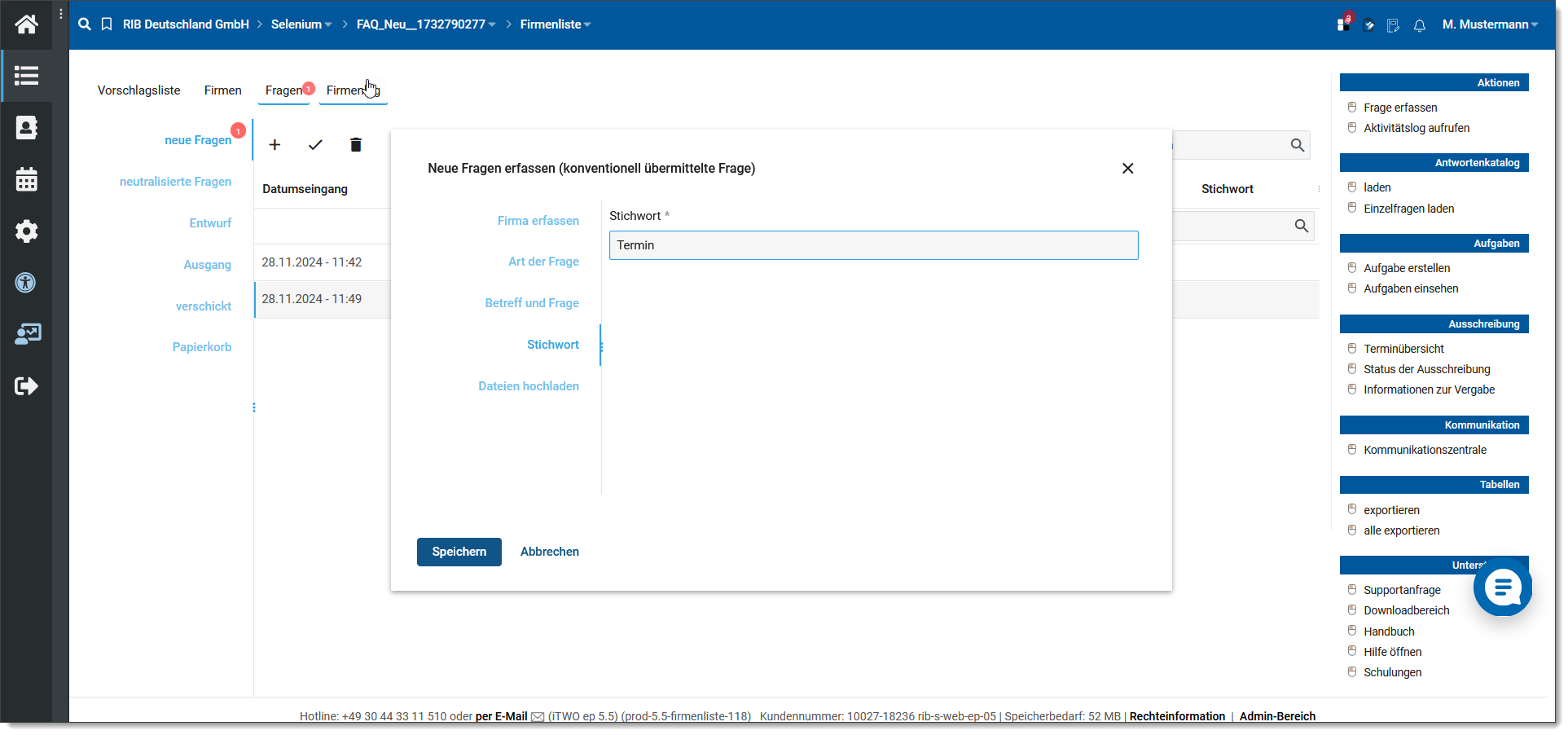 Ein oder mehrere Stichwörter können bei sowohl bei konventionellen Fragen, als auch bei Fragen die der Bieter digital über iTWO Tender (Bieterplattform unter www.meinauftrag.rib.de) gestellt hat zugeordnet werden.