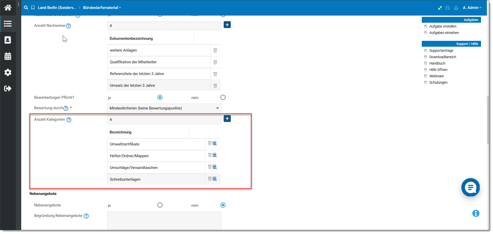 •Es können verschiedene Kategorien für Leistungen und deren Eignungskriterien festgelegt werden.