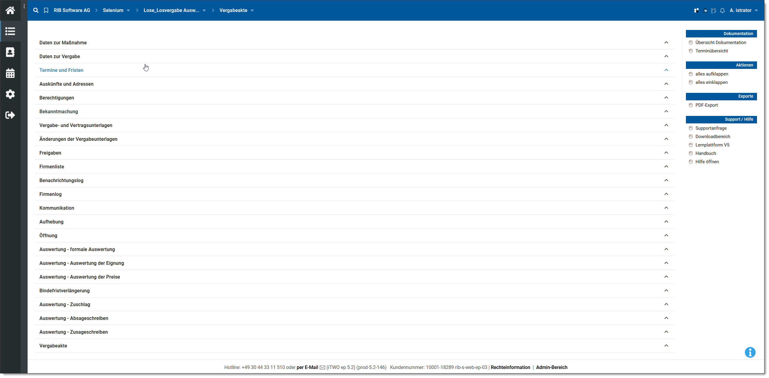 Wählen per Doppelklick Sie den Bereich oder die Bereiche, den Sie einsehen wollen. Über das Aktionen-Menü können Sie zusätzlich alle Bereiche auf- oder einklappen. Wenn Sie die Vergabeakte als PDF ausgeben wollen, klicken Sie auf PDF-Export.