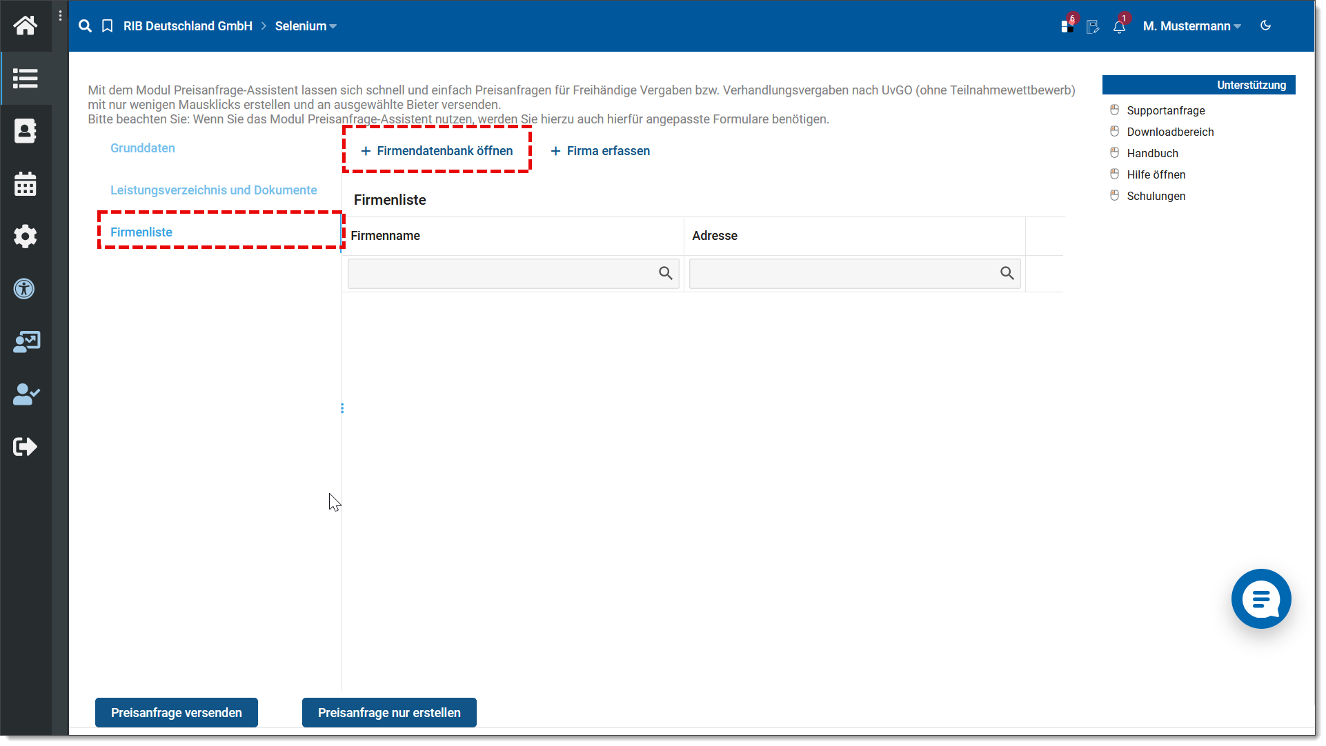•Über die Funktion + Firmendatenbank öffnen, wählen Sie Firmen aus der Adressdatenbank aus, an welche diese Preisanfrage verschickt werden soll.