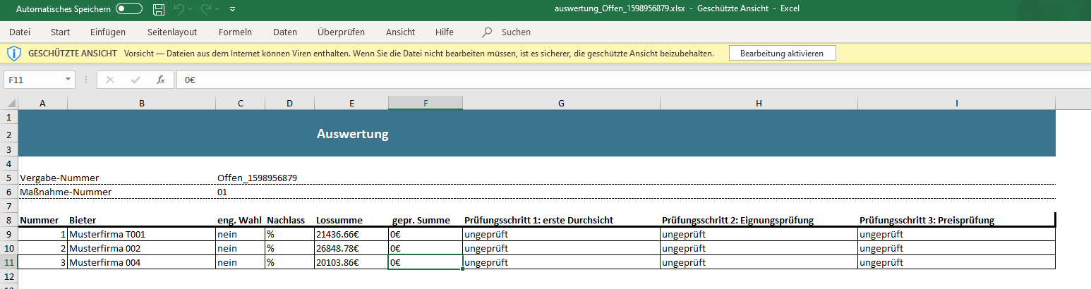 Über Ihre Auswahl Excel-Export wird Ihnen ein Excel Dokument generiert in dem Sie die Lose, Bieter, Preise, Kommentare, Prüfungsschritte, etc. einsehen und ggf. bearbeiten können.