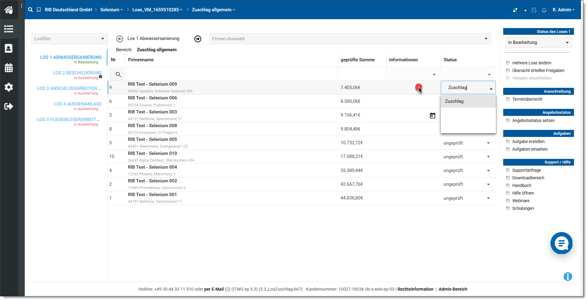 Wählen Sie den Bieter aus, der den Zuschlag erhalten soll. Für den zu bezuschlagenden Bieter wird der Status in der Auswahlliste auf Zuschlag gesetzt. Lesen Sie hierzu das Kapitel Freigabeprozess.