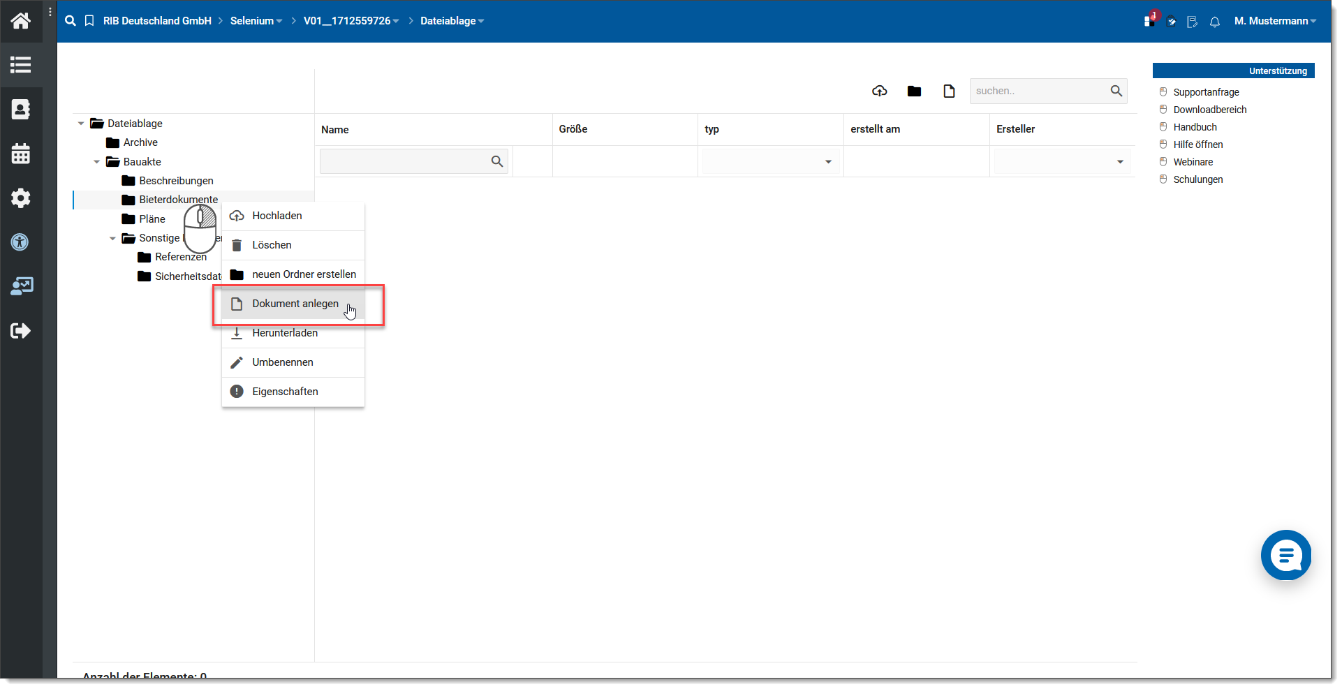 Innerhalb der Dateiablage können Sie für jede Vergabe eine beliebige Ordnerstruktur anlegen. Es besteht auch die Möglichkeit diese Ordnerstruktur einmalig am Mandanten in der Konfiguration für alle Verfahren vorzudefinieren.