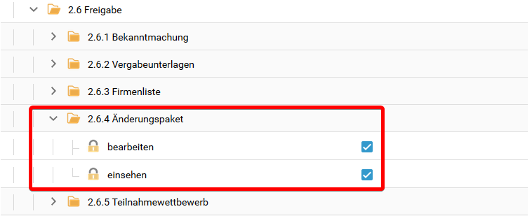 Der Änderungsassistent wird im Rechte- und Rollenkonzept über den Punkt 2.4.1 Änderung der Vergabeunterlagen gesteuert. Die hier gezeigte Darstellung dient als Übersicht über mögliche Rechte in diesem Prozess und stellt keine Empfehlung für die Konfiguration der Rechte in ihrem Mandanten dar. Bitte passen Sie diese nach Ihren Anforderungen an.