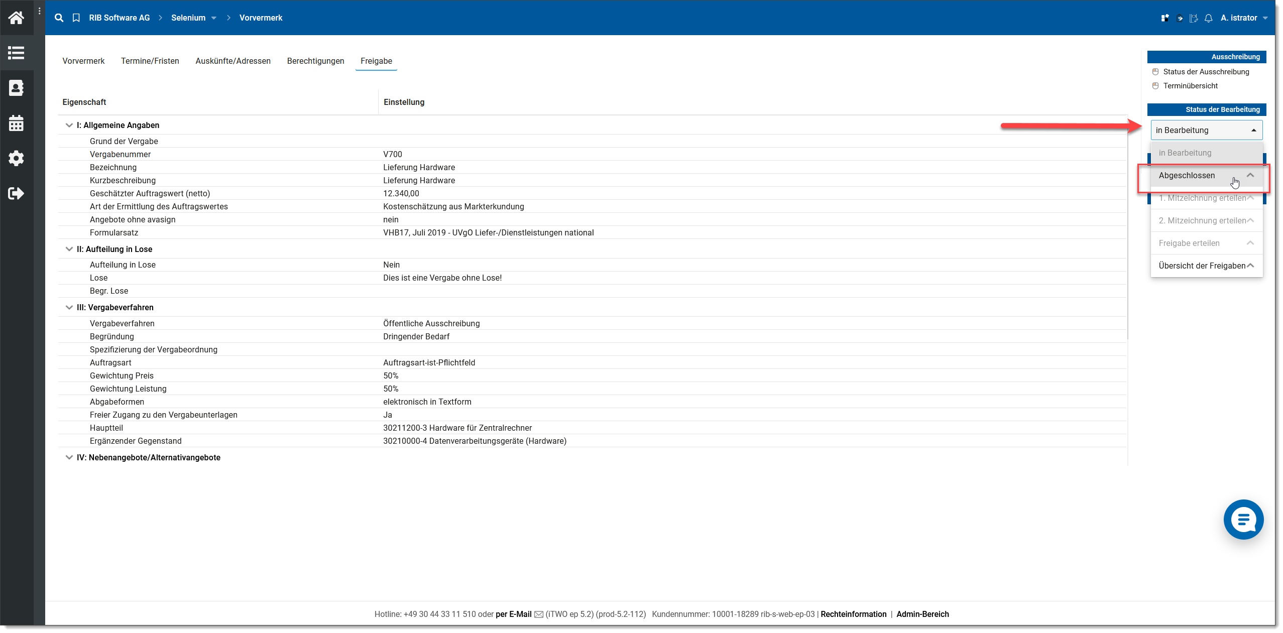 Wählen Sie hierzu im Aktionen-Menü im Bereich Status der Bearbeitung | Abgeschlossen aus. Sie können den Vorvermerk auch als PDF - Export ausdrucken. Nach dem die Bearbeitung abgeschlossen ist, muss der Vorvermerk noch freigeben werden. Erst mit der Freigabe wird aus dem Vorvermerk eine Vergabe erzeugt.