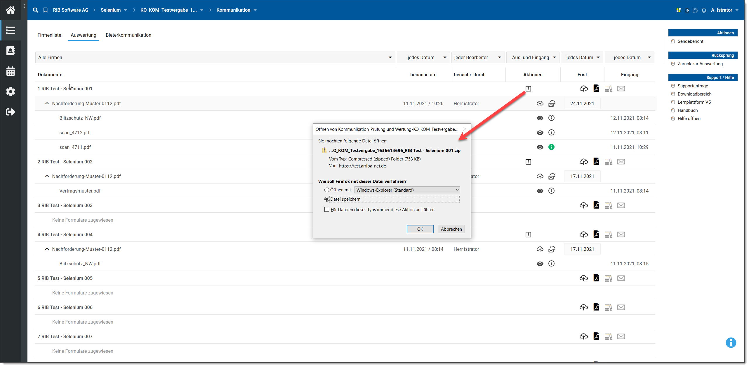 Die Funktion Bieter die Möglichkeit alle von einem Bieter hochgeladenen oder dem Bieter zugeordnete Dokumente als ZIP-Archiv zu exportieren.