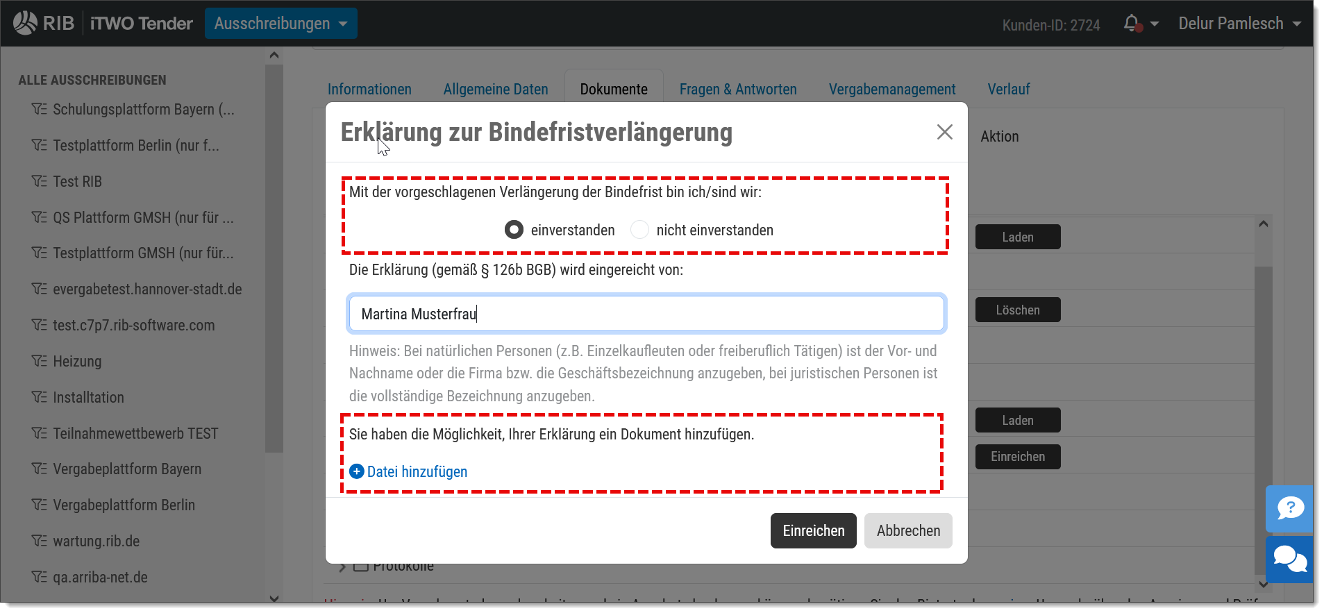 Navigation: Vergabeplattform: RIB eVergabe > Arbeiten mit der Plattform > Auswertung und Zuschlag > Bindefristverlängerung