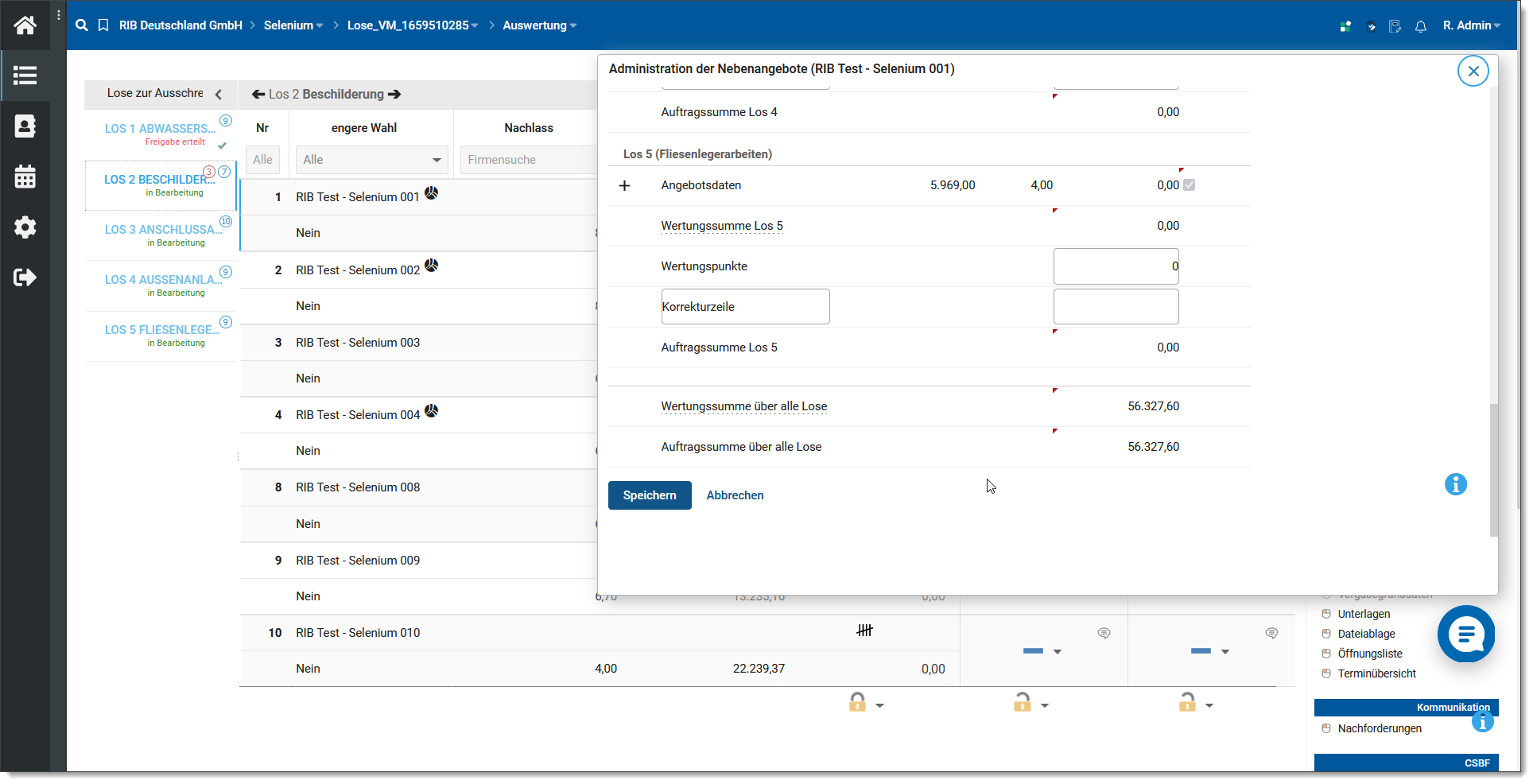 In der ersten Zeile finden Sie immer die Angebotsdaten des Bieters. Hier werden die ungeprüfte Summe und ein eventuell vorhandener Nachlass aus der Öffnung, sowie die geprüfte Summe des Bieters angezeigt.