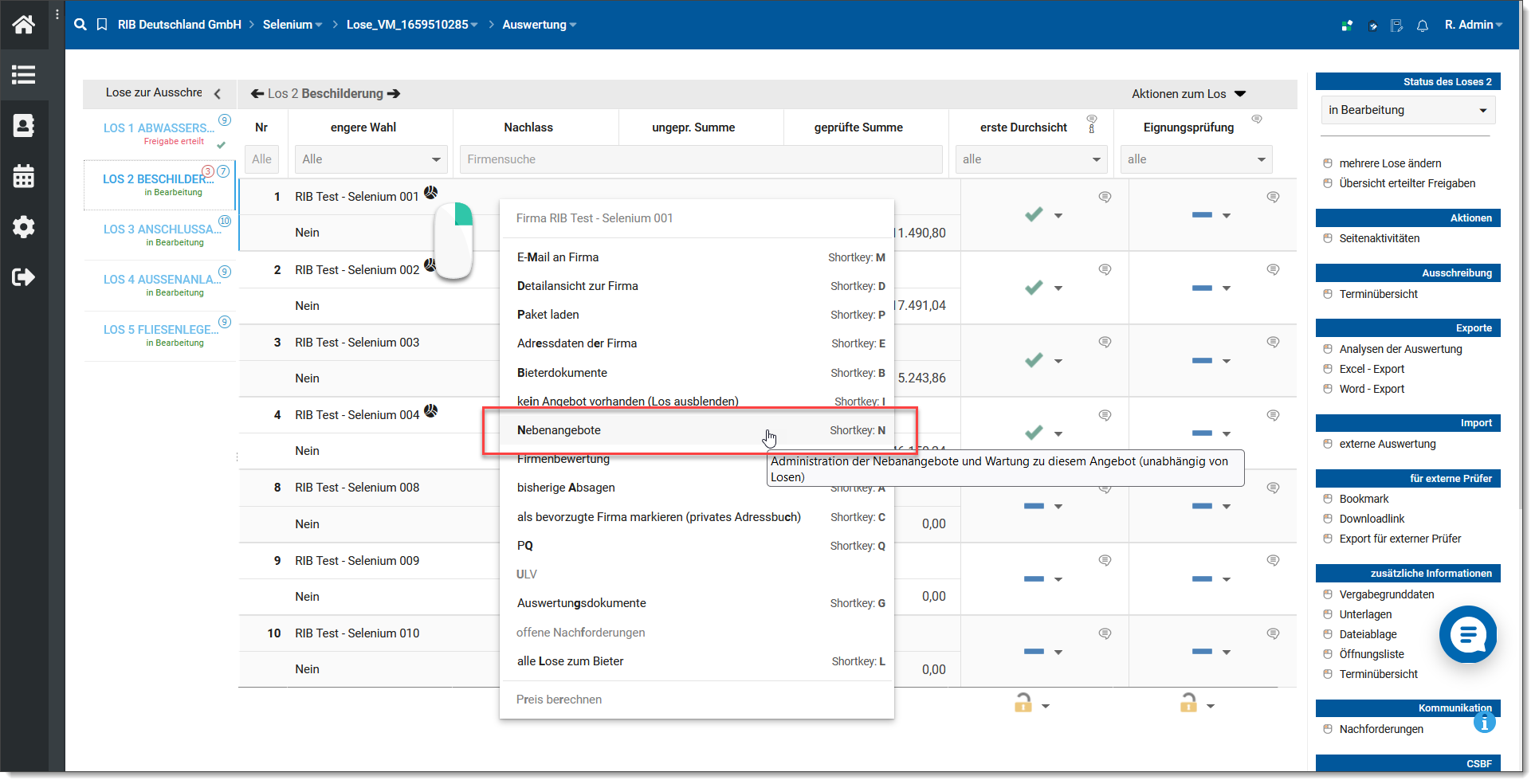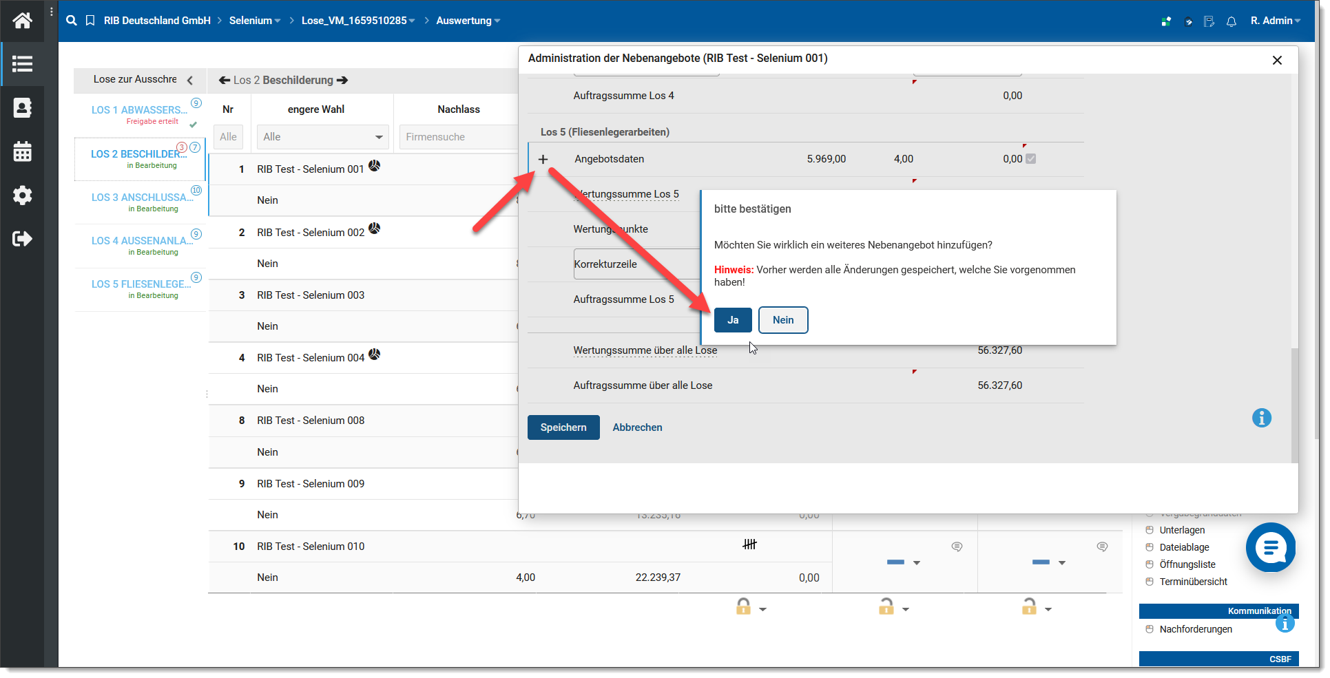 Es wird dann eine neue Zeile angelegt bei der Sie den Namen des Nebenangebotes, die ungeprüfte Summe, einen möglichen Nachlass sowie die geprüfte Summe erfassen können.