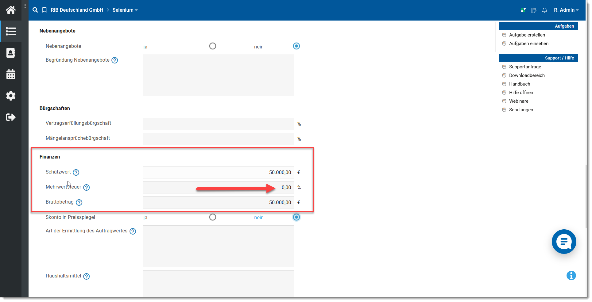 Setzen Sie die Mehrwertsteuer in den Grunddaten auf 0%. In diesem Fall kann der Bieter im Bieterclient ava-sign keine Umsatzsteuer eintragen und die Angebotssumme entspricht dann der Nettosumme.