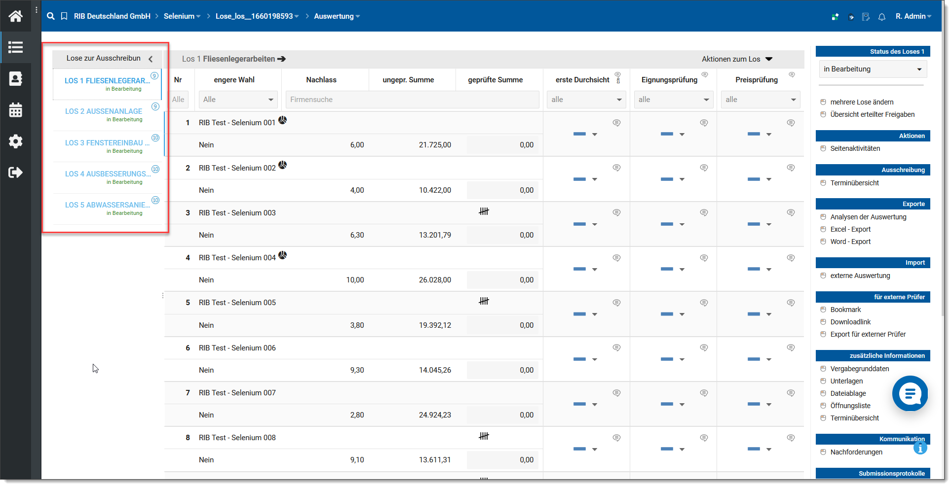 Die Wertung wird für jedes Los durchgeführt. Auf Losebene werden alle Bieter, die ein Angebot zu diesem Los abgegeben haben, angezeigt und können bewertet werden.
