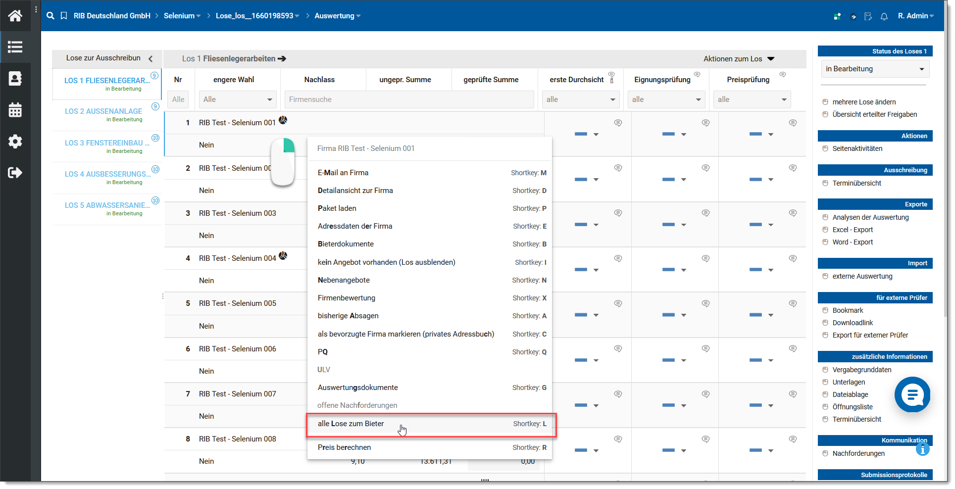 Sollte eine Bearbeitung aller Lose zum Bieter notwendig werden, so ist ein Wechsel in diese Betrachtung über das kontextsensitive Menü zum Bieter möglich. Beispielsweise können so Absagen zu allen Losen des Bieters erstellt werden, wenn dieser in der ersten Durchsicht (rein formell) nicht bestanden hat.