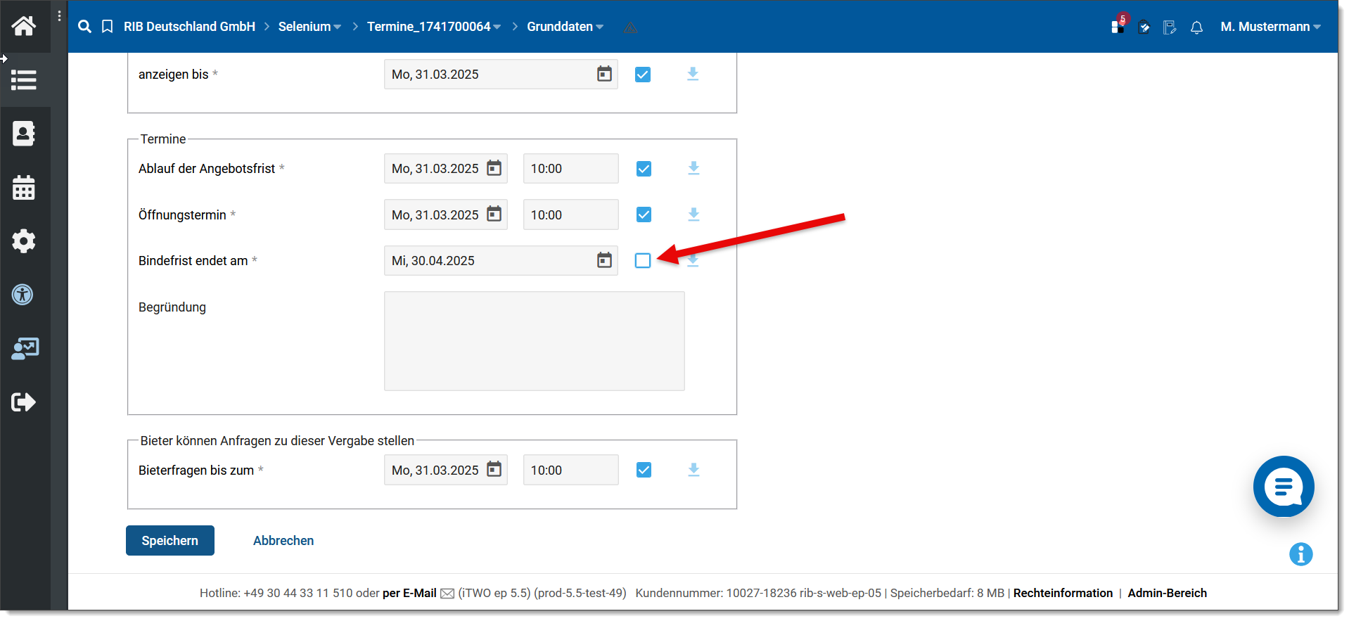 Termin wird auf den Detailseiten in iTWO Tender nicht angezeigt. |