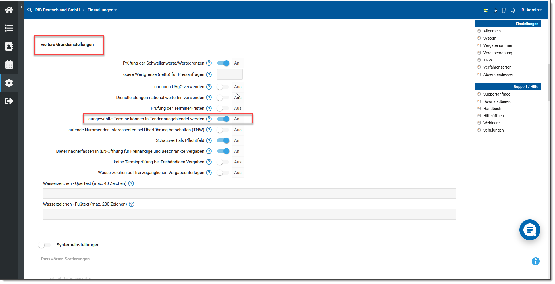 Darüber hinaus kann dies pro Verfahren manuell vom Benutzer festgelegt werden. Hierzu muss dem entsprechende Benutzer dann das Recht Termin in iTWO Tender ausblenden zugeordnet sein und zusätzlich auch die Funktion in der Konfiguration aktiviert sein.