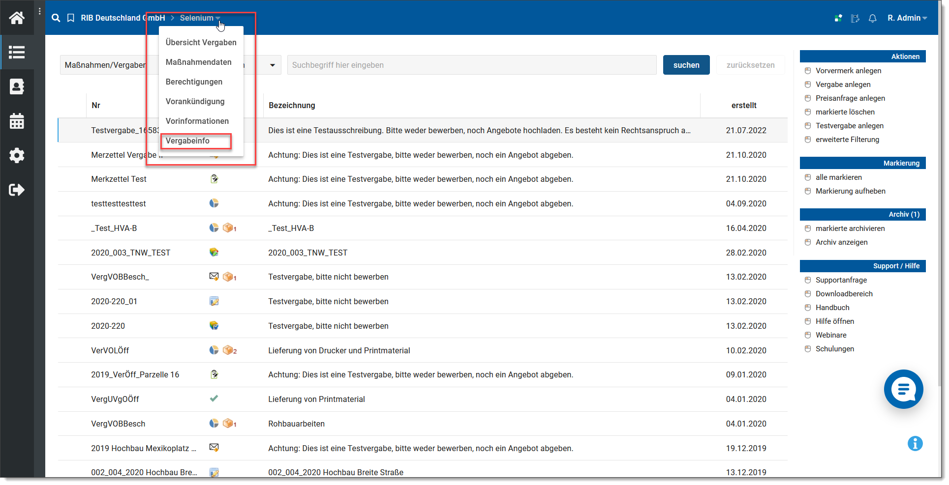 Im Bereich Aktionenmenü wählen Sie nun den Befehl Vergabeinfo anlegen.