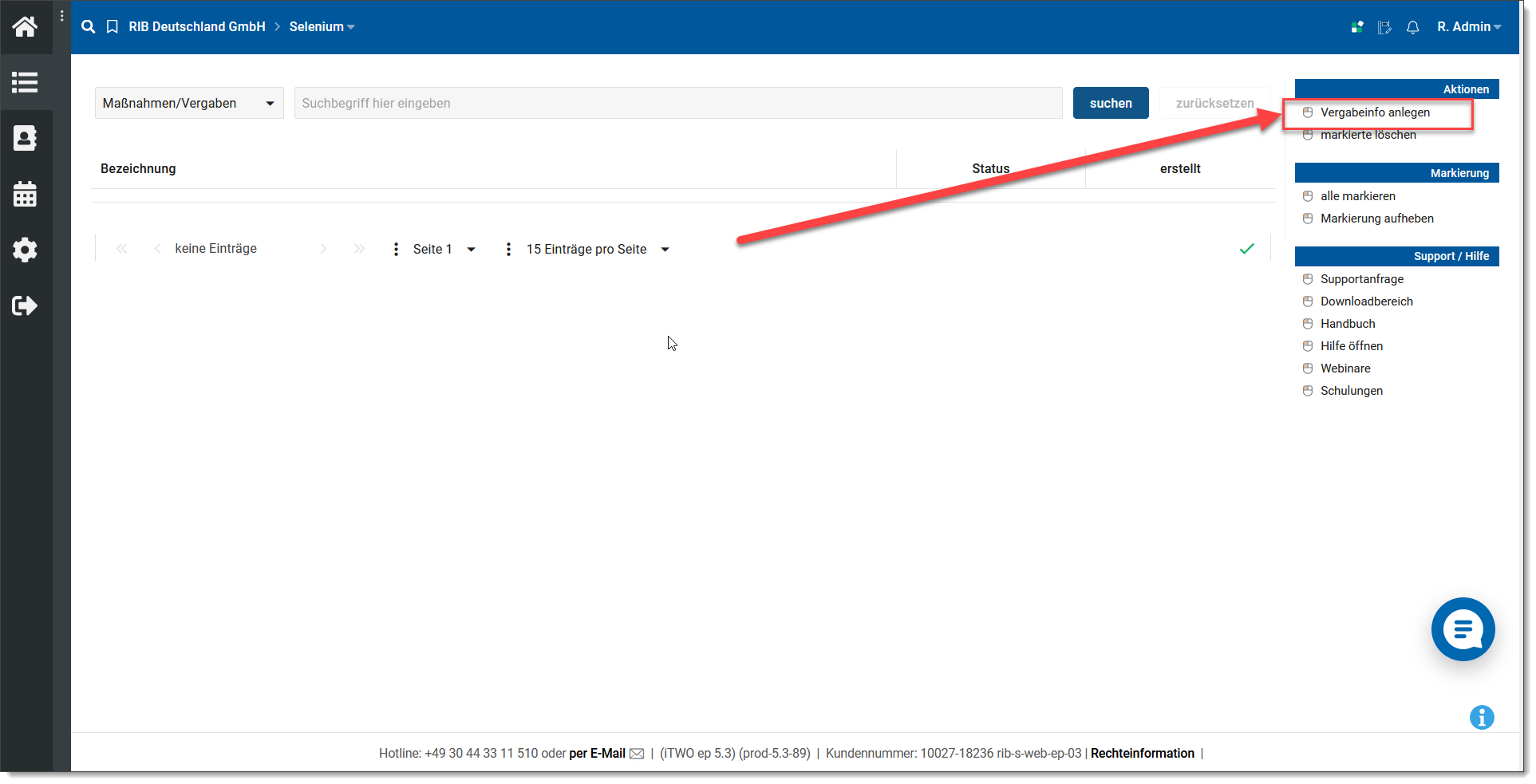 Um eine freie Vergabeinformation zu einer Maßnahme auszuwählen, wählen Sie auf der Ebene der Maßnahme den Register Vergabeinfo.
