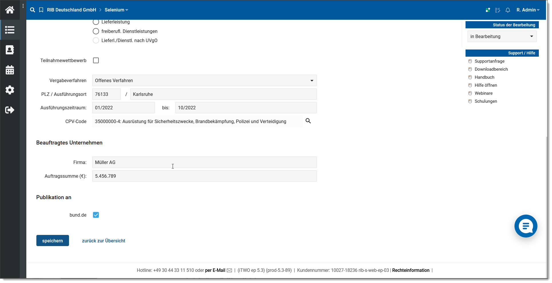 Erfassen Sie die entsprechenden Daten und klicken Sie im Anschluss auf Speichern. Mit Klick auf Speichern haben Sie die Möglichkeit die Vergabeinformation sofort zu veröffentlichen.
