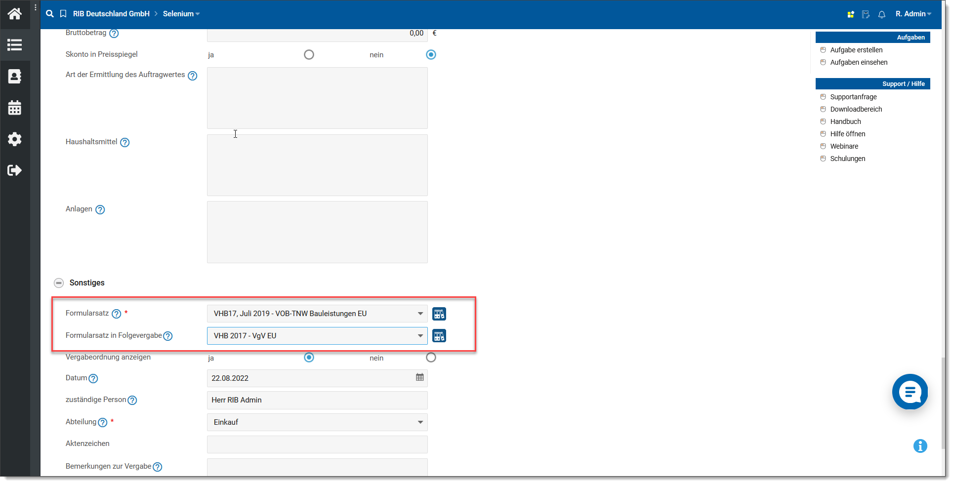 Die Auswahl erfolgt beim Anlegen der Vergabe, wie im folgenden Bild dargestellt: