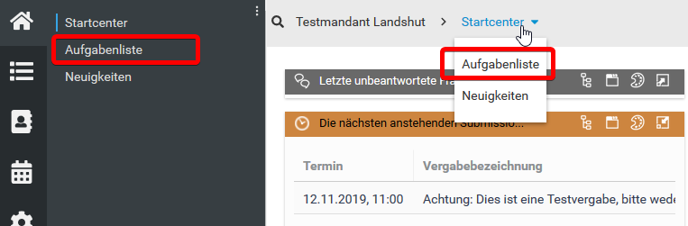 Bei der Bearbeitung der Vergabeunterlagen können Sie sich die Aufgabenliste ansehen bzw. für verantwortliche Benutzer auch Neue Aufgaben definieren. Die verantwortlichen Benutzer werden dann sofort oder in Abständen per E-Mail benachrichtigt. Lesen Sie hierzu auch den Abschnitt Start-Center.
