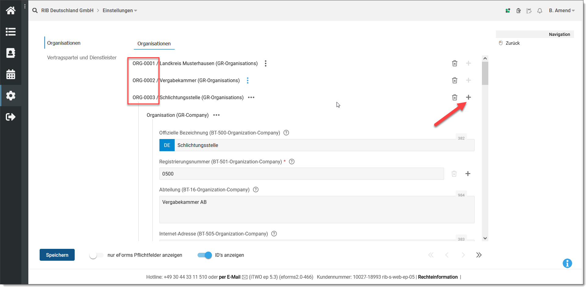 Über das Plus-Zeichen (+) oben rechts in der Maske können, immer von der letzten Organisation aus, weitere Organisationen hinzugefügt werden.