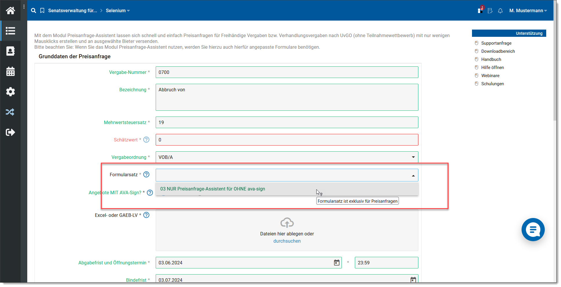 Falls ein Formularsatz für den Preisanfrage-Assistenten passend ist, können Sie ihn mit einem einfachen Klick markieren.