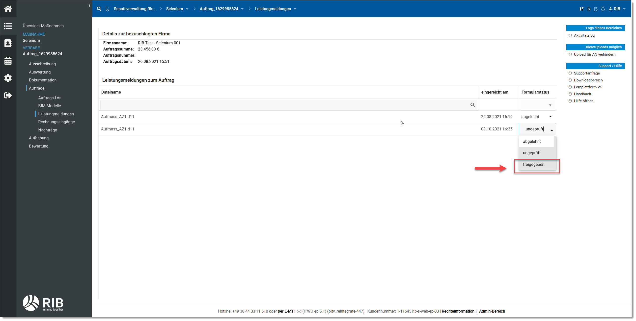Wurde das Dokument durch die Vergabestelle oder die Fachabteilung oder ein externes Büro geprüft und zum Beispiel erfolgreich in ein AVA-System zur Weiterverarbeitung eingelesen, so kann der Status des Dokumentes auf freigegeben gesetzt werden.