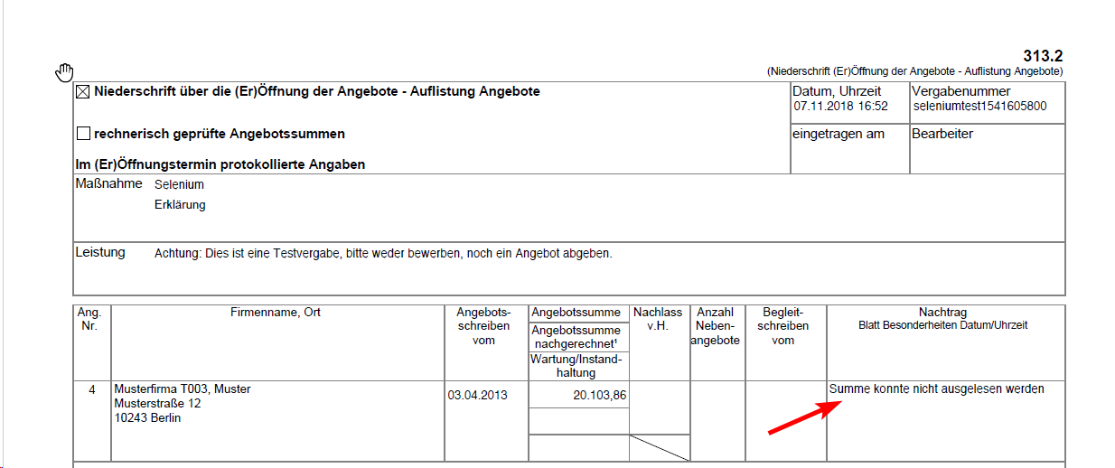 Kann die Summe eines Bieters aus einem digitalen Angebot in der Eröffnung nicht automatisch ausgelesen werden, so kann diese im Nachtrag zur Eröffnung korrigiert bzw. nachgetragen werden.
