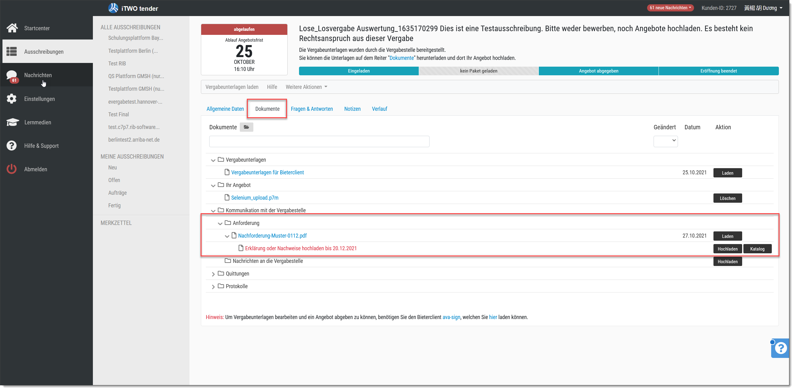 Das Bild zeigt das Bieterportal iTWO tender (Bieterplattform unter www.meinauftrag.rib.de). Die Firma wurde über die An- oder Nachforderung per E-Mail informiert und hat die Vergabe aufgerufen. Auf dem Register Dokumente wird im Abschnitt Anforderung das Dokument mit der Frist aus dem Beispiel von oben angezeigt. Die Firma kann das Dokument hier laden, einsehen und das Dokument, dass Sie wiederum einreichen muss bis zur Frist direkt hochladen.